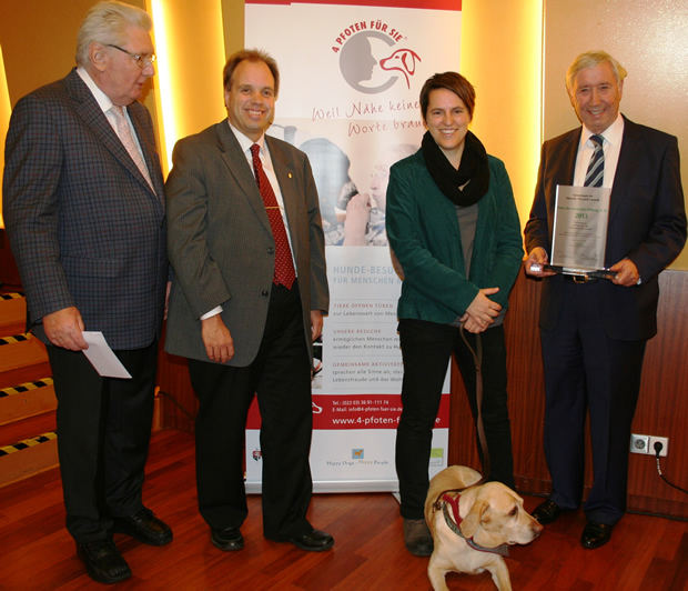 Am 25. November wurde der Hunde-Besuchsdienst für Menschen mit Demenz „Vier Pfoten für Sie“ mit dem Karmetta-Förderpreis 2013 ausgezeichnet. Das Projekt in Trägerschaft der Alexianer Köln GmbH lebt weitgehend von der ehrenamtlichen Arbeit engagierter Hundehalter und Ihrer Vierbeiner. Bei der feierlichen Preisverleihung in der „Residenz am Dom“ waren neben Änne Türke, Leiterin des Projekts, und Peter Scharfe, Regionalgeschäftsführer der Alexianer Köln GmbH, auch viele Hundehalter und ihre Vierbeiner anwesend. Thomas Schröder, Präsident des Deutschen Tierschutzbundes (Karmetta-Preisträger 2012), berichtete über die aktuellen Schwerpunkte in der Tierschutzarbeit und über die Fortschritte bei der Ausbildung von Tierschutzlehrern. Die Übergabe des mit 1.000 Euro dotierten Förderpreises übernahmen der Vorstandsvorsitzende der Karmetta-Stiftung, Bernd Oppermann, und der Vorsitzende des Stiftungskuratoriums, Heinrich Nopper, gemeinsam.